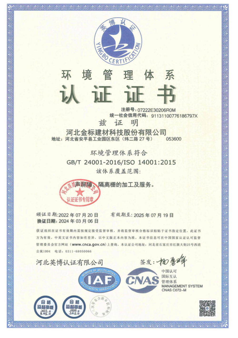 河北金標(biāo)建材科技股份有限公司成立于2005年,1998年開(kāi)始建廠生產(chǎn),是一家國(guó)內(nèi)較早從事交安材料的專(zhuān)業(yè)生產(chǎn)廠家之一;公司占地200萬(wàn)畝,擁有員工400余名,注冊(cè)資金6040萬(wàn), 已通過(guò)ISO9001質(zhì)量管理體系認(rèn)證,具備產(chǎn)品批量生產(chǎn)合格證、多項(xiàng)檢測(cè)報(bào)告等,先后獲得“AAA級(jí)信用企業(yè)”、河北優(yōu)秀企業(yè)”等殊榮。公司業(yè)務(wù)經(jīng)營(yíng)范圍包括高速公路、鐵路聲屏障生產(chǎn)基地;隔離柵,防護(hù)柵欄、刺鐵絲生產(chǎn)基地。